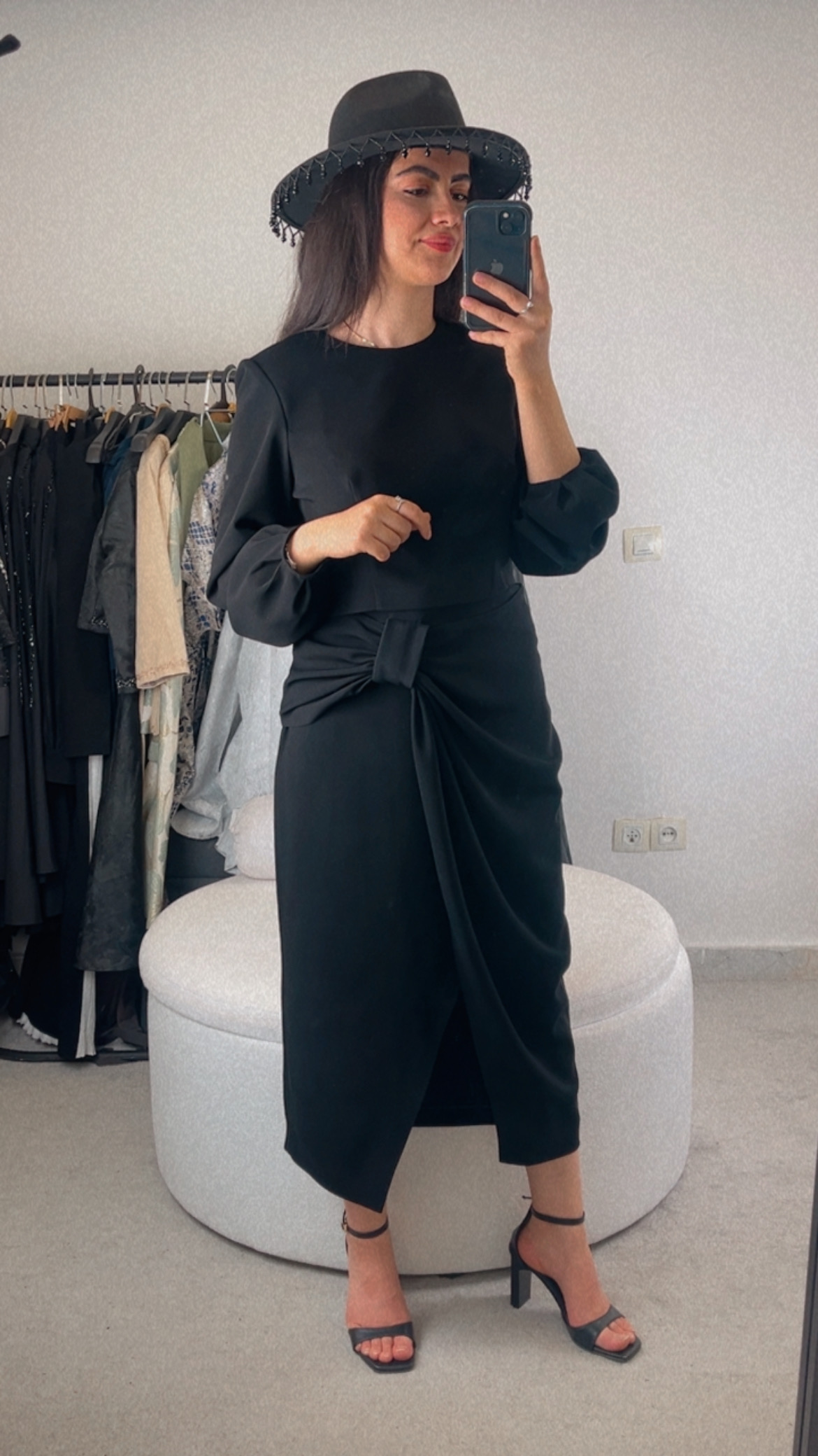 ست بلوز و دامن کرپ با طراحی شیک و جذاب؛ روی دامن پاپیون ظریف کار شده که جلوه‌ای خاص به استایل می‌دهد. این کار در سایزبندی کامل و در رنگ دلخواه قابل سفارش است