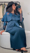 ست کت و دامن سرمهای سلطنتی یکی از گزینههای فوقالعاده شیک و جذاب برای مهمانیها و مراسم رسمی است. روی کت این ست، دانتل ظریف و کارشده استفاده شده که جلوهای مجلل و زنانه ایجاد میکند. دامن کار نیز به صورت پلیسه طراحی شده که ضمن داشتن ایستایی زیبا، استایل را بسیار لطیف و چشمگیر نشان میدهد.