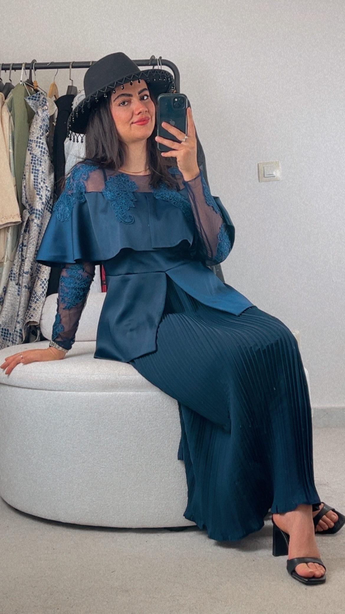 ترکیب رنگ سرمهای سلطنتی با دانتل و پلیسه، این ست را به انتخابی لوکس و متفاوت تبدیل کرده است؛ مناسب برای کسانی که به دنبال ظرافت، کیفیت و جلوهای خاص در پوشش خود هستند