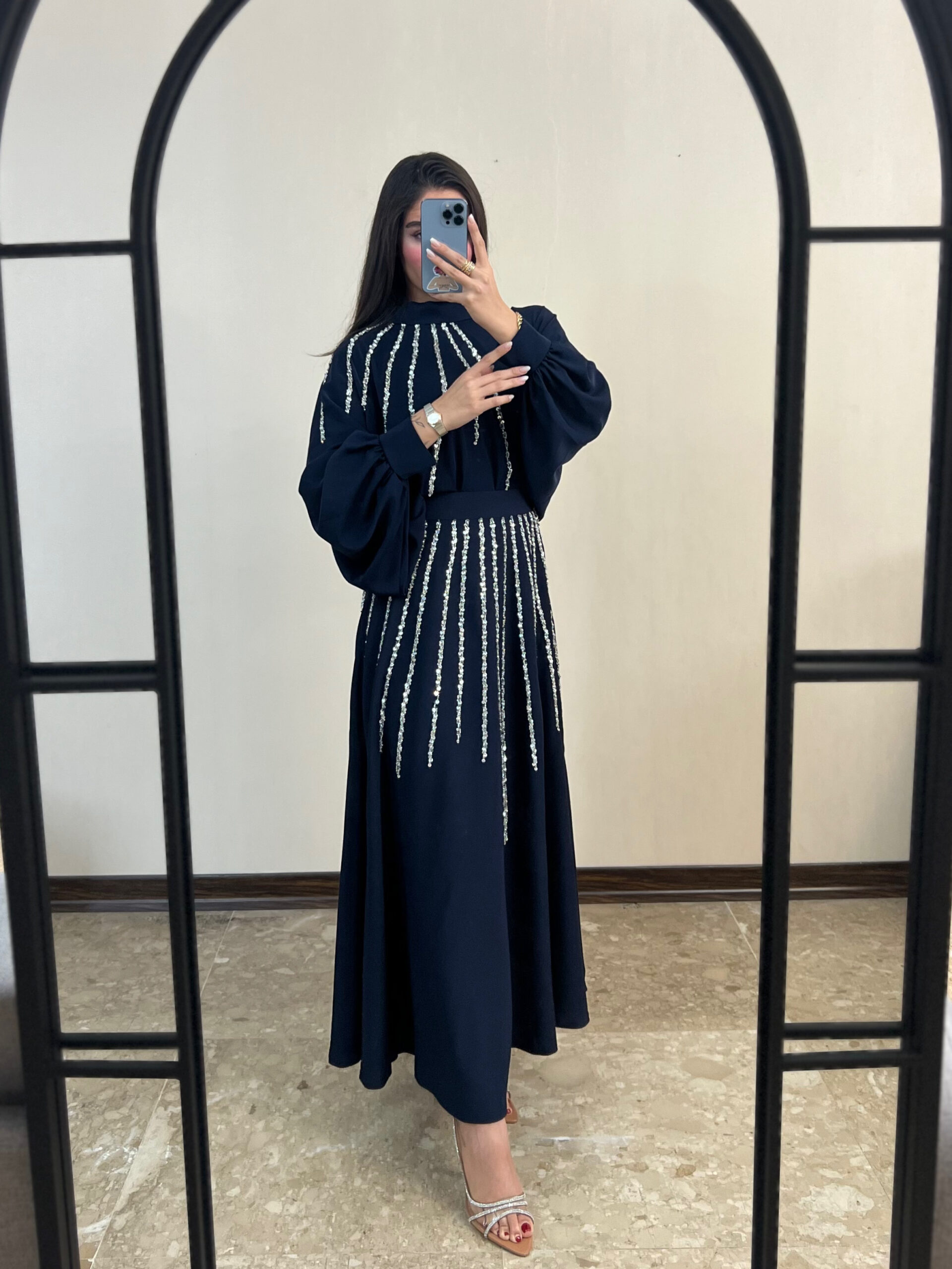 ست شومیز و دامن کرپ کار شده با دست، در رنگ سرمهای زیبا و تزئینات نقرهای جذاب. انتخابی شیک و زنانه برای مجالس و دورهمیهای خاص