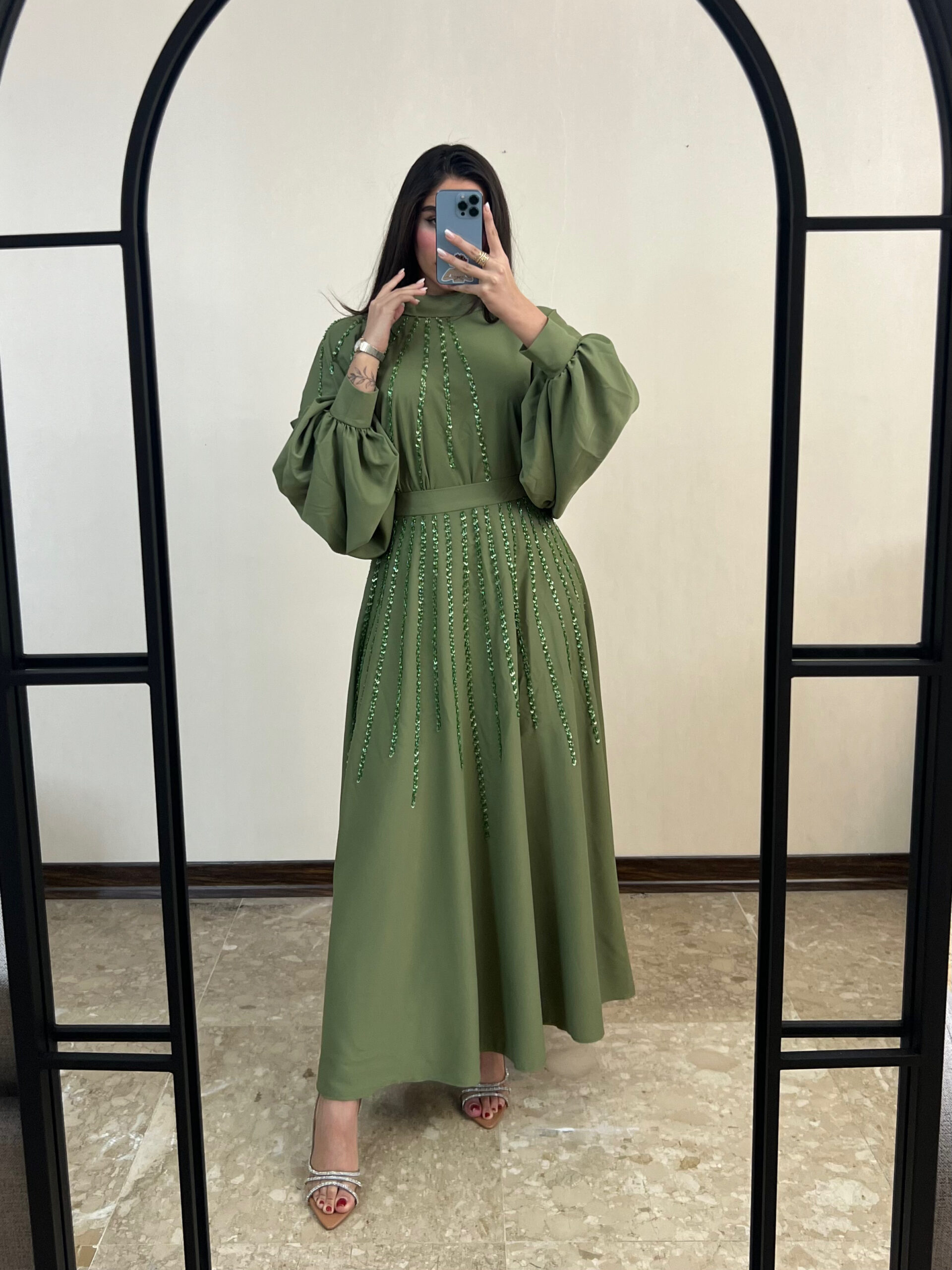 ست شومیز و دامن کرپ در رنگ سبز چشمنواز، با کار دست ظریف و طراحی خاص. انتخابی شیک و متفاوت برای مجالس و مهمانیها