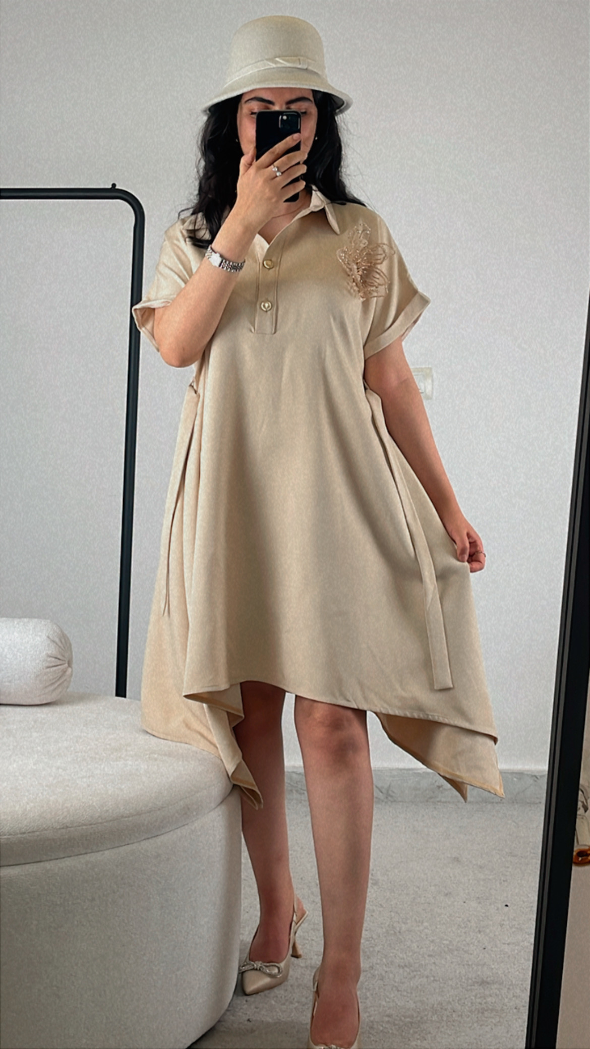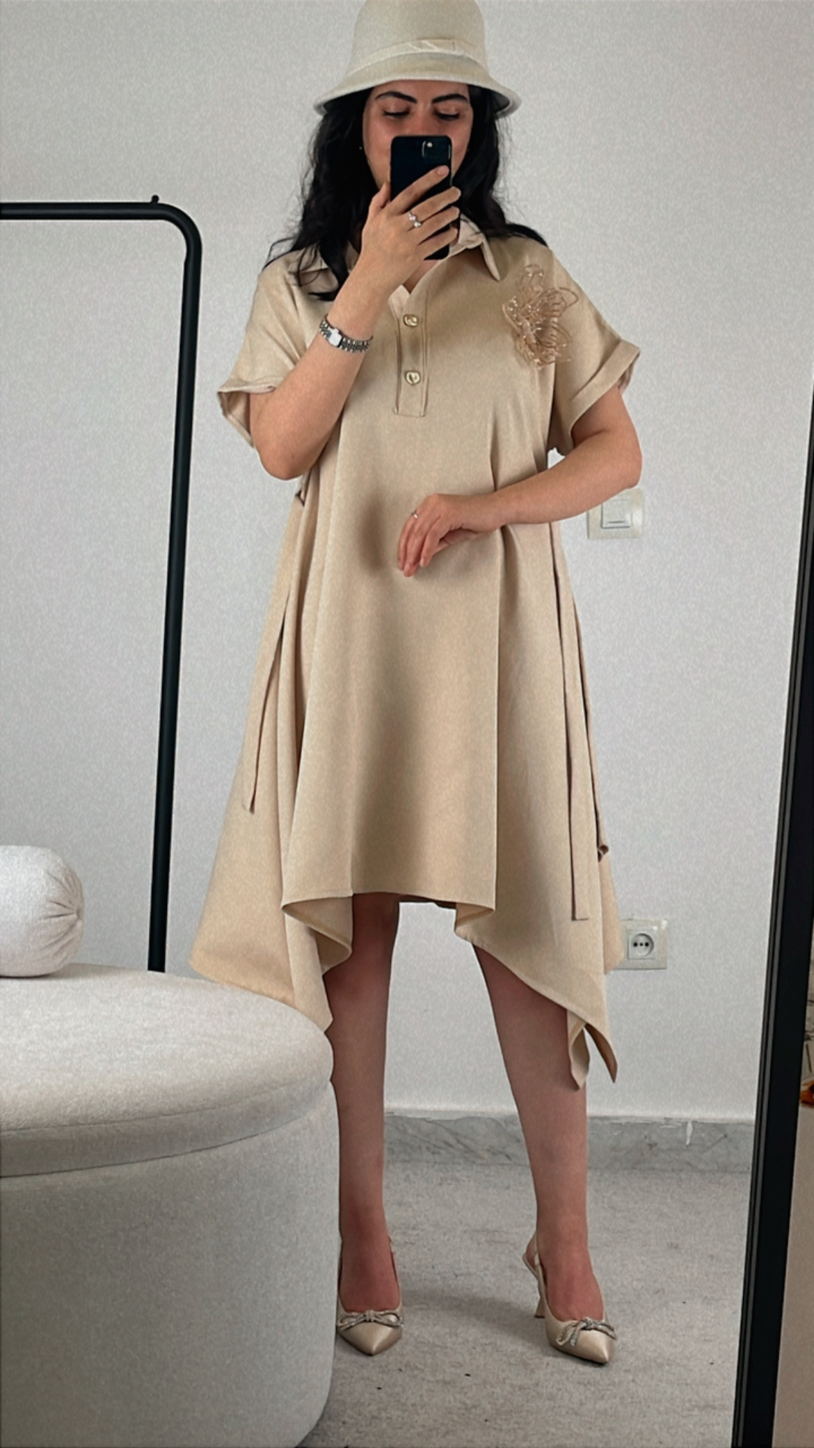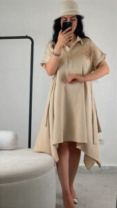 پیراهن با برش مربعی در پهلوها که باعث جمع‌وجورتر دیده شدن اندام شده و پهلو و شکم را به‌خوبی می‌پوشاند. انتخابی بسیار مناسب برای دوران بارداری و با توجه به دکمه‌های جلوی لباس، کاملاً کاربردی برای دوران شیردهی پس از بارداری.