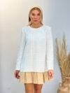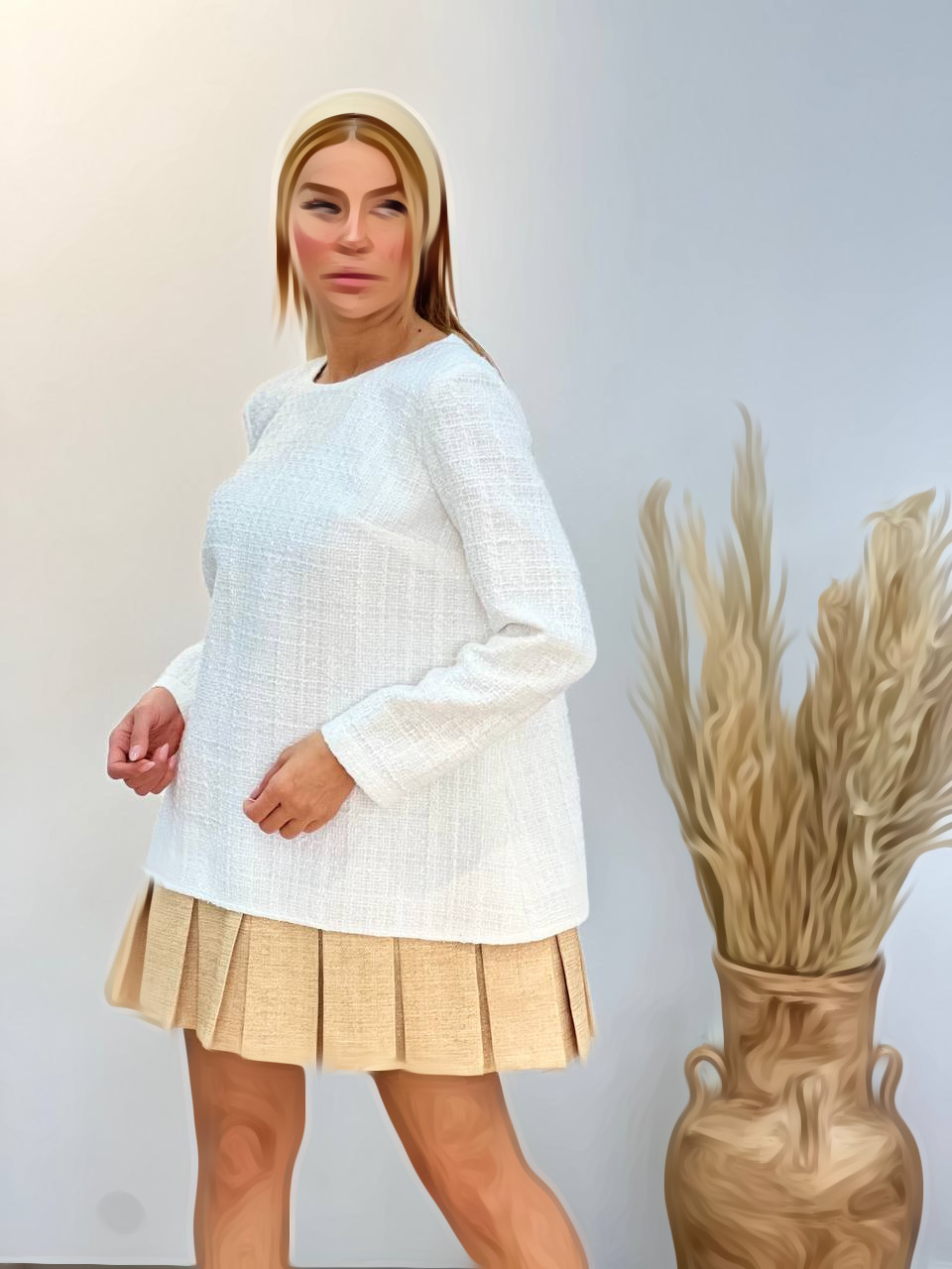 پیراهن شنل سفید با پیلی‌های طلایی، مدلی لوکس و متفاوت است که با استر داخلی و لایی لمینیت شده، ایستایی بی‌نقصی دارد و برای مجالس رسمی انتخابی شیک و خاص محسوب می‌شود