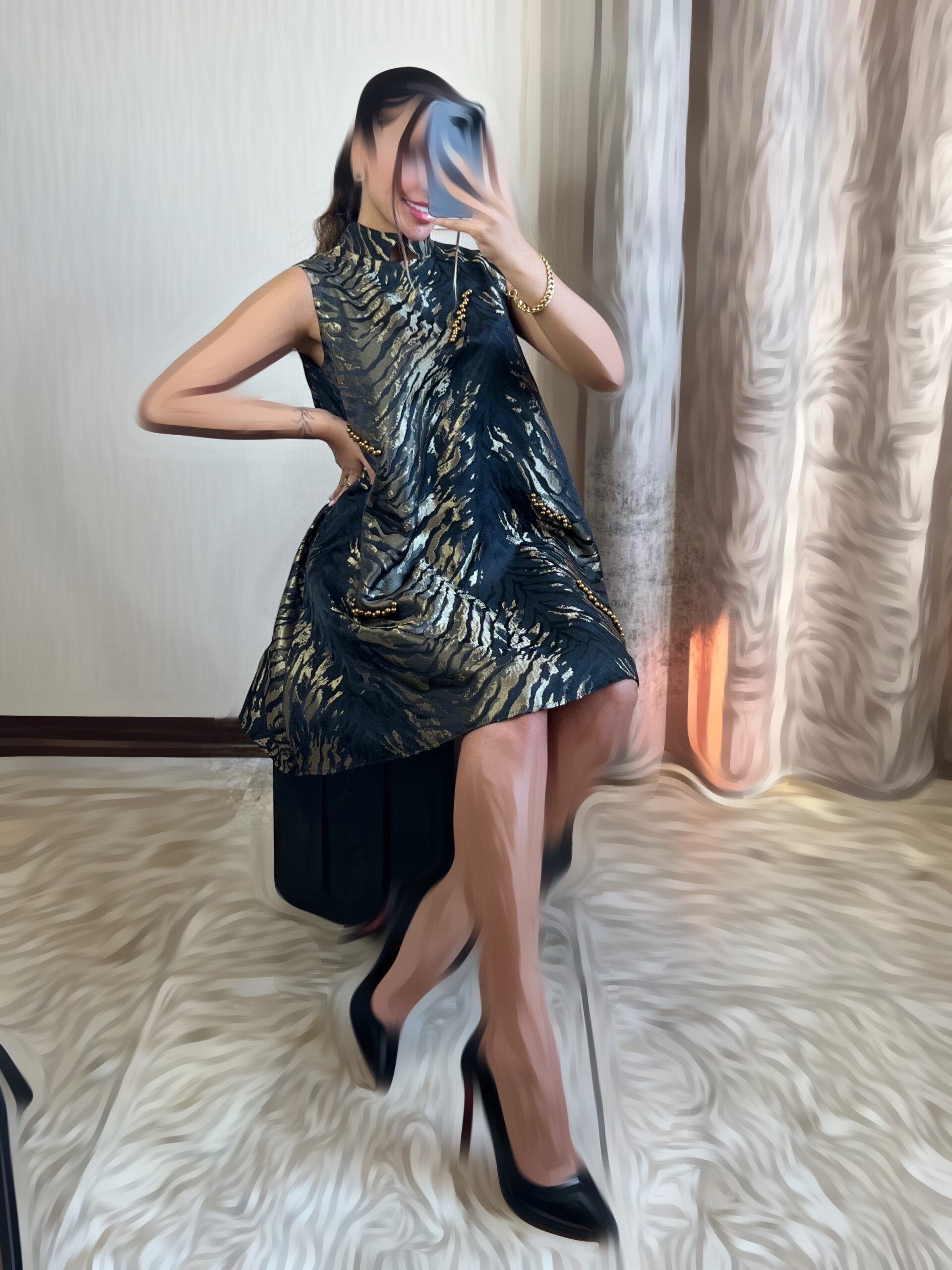 جنس ژاکارد بافتدار، هم از نظر استحکام و هم از نظر ظاهر، حس لوکس و متمایزی ایجاد میکند. تزئینات مرواریددوزی کار دست بهصورت ظریف روی لباس اجرا شده تا درخشش و جذابیتی زنانه و خاص بیافریند.