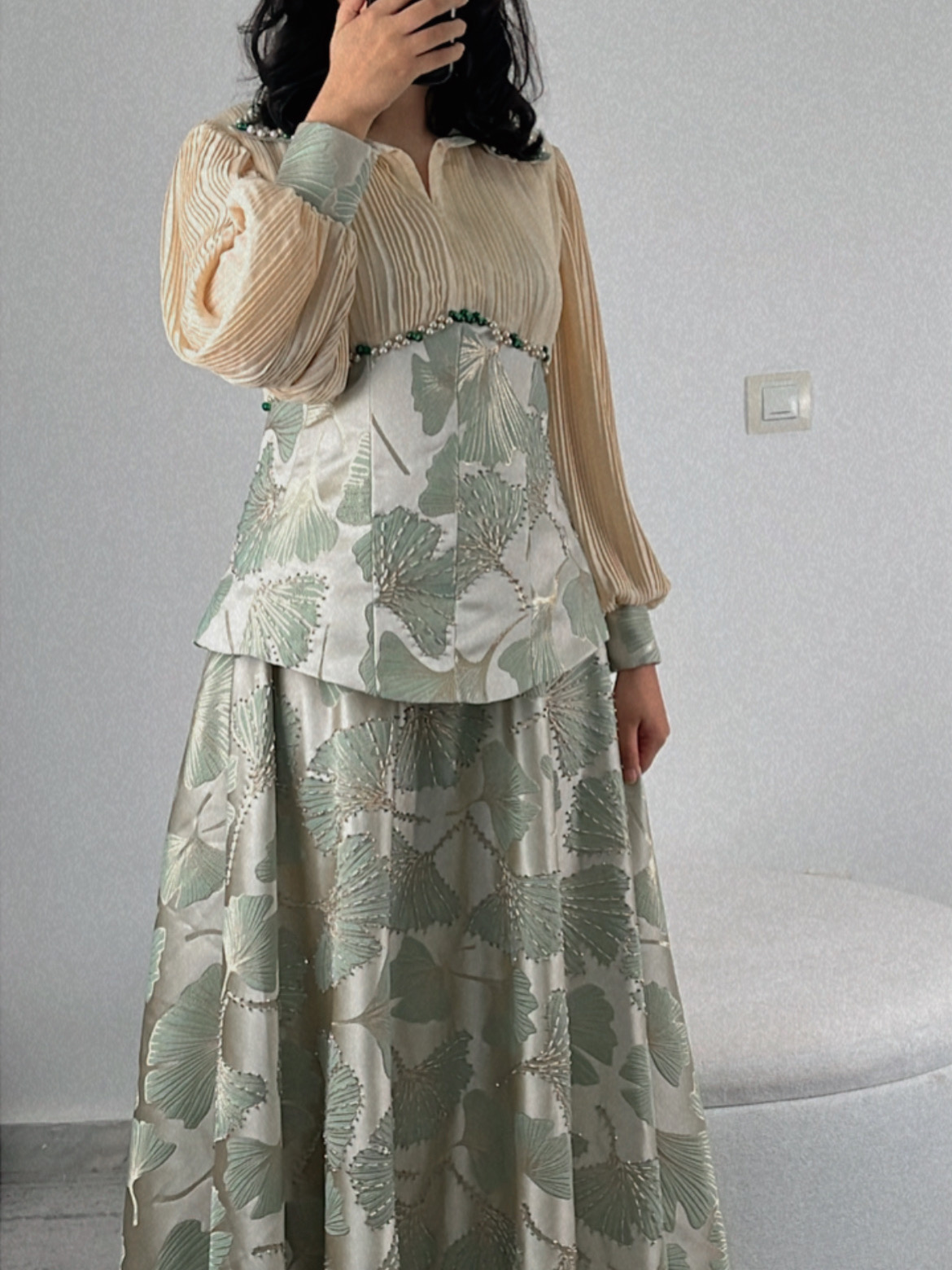 پیراهن ژاکارد با یقه مردانه، کار دست مرواریددوزی شده؛ ترکیبی از وقار و ظرافت.