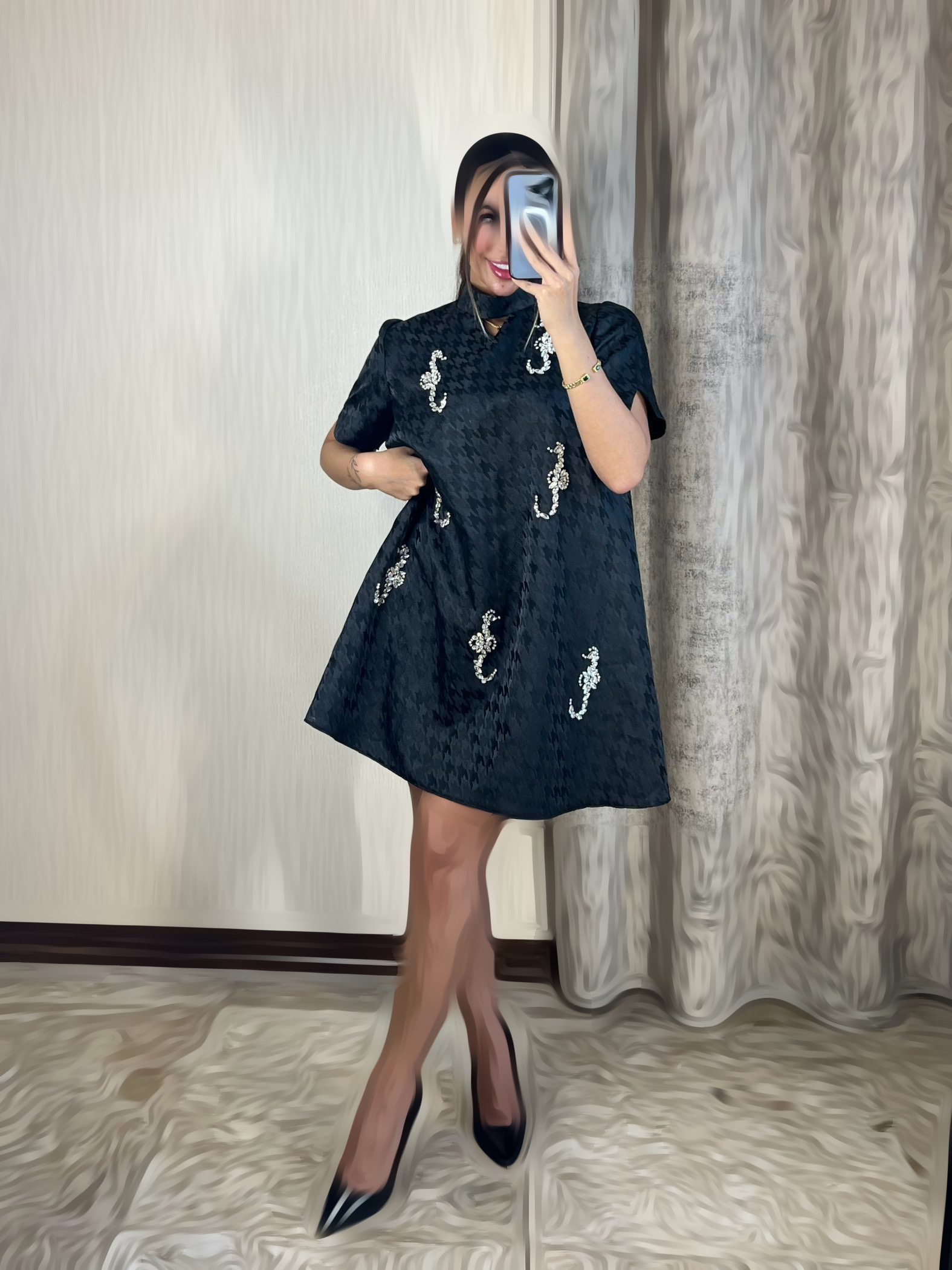پیراهن ژاکارد با طرح اسب دریایی، لباسی شیک و خاص است که پارچه‌ی ژاکارد آن با نقش‌های ظریف و برجسته جلوه‌ای لوکس ایجاد می‌کند. تزئین نگین‌ها روی طرح اسب دریایی، جلوه‌ای درخشان و چشم‌نواز به لباس بخشیده و آن را مناسب مهمانی‌ها و مجالس رسمی کرده است