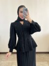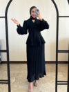 ست کت و دامن کرپ مشکی با دامن پلیسه و کت کار دست، دارای بندینک تنظیمی پشت کمر؛ انتخابی شیک و کلاسیک برای استایل رسمی و مهمانیها.