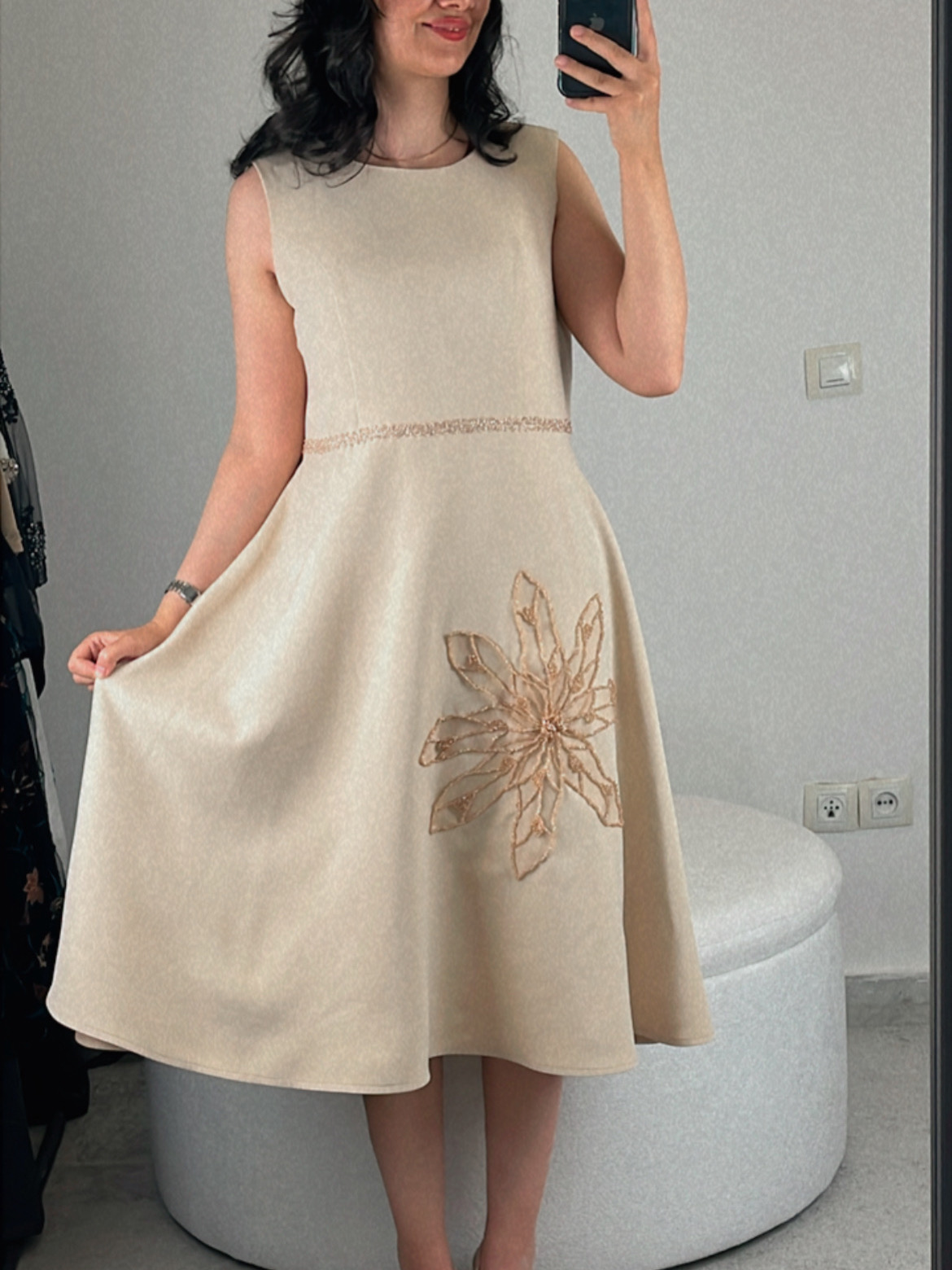 پیراهن و کت شیک مزونی در رنگهای مشکی و کرم، دوختهشده از پارچههای کرپ و ژاکارد با کار دست بینظیر روی لبه آستین، کمر و پایین دامن. دوخت تمیز، استردار و طراحی خاص برای استایلهای رسمی و مجلسی.