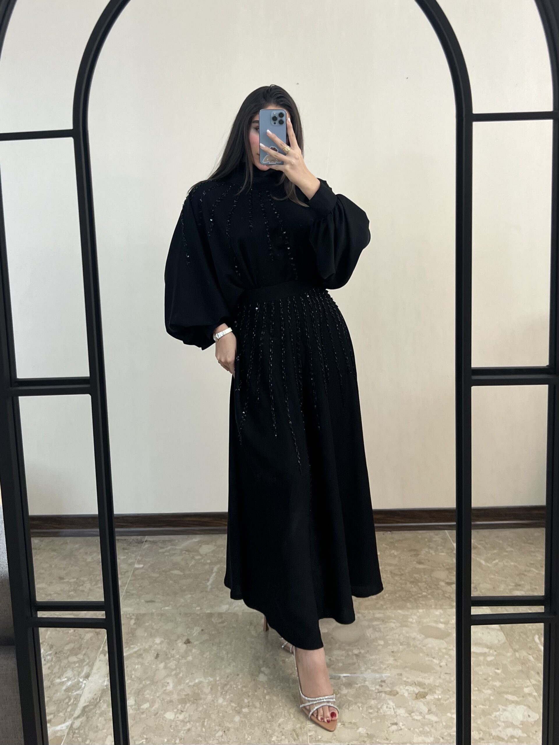 ست شومیز و دامن کرپ مشکی با کار دست ظریف و هنرمندانه؛ انتخابی شیک، خاص و همیشه جذاب برای مجالس و مهمانیها.